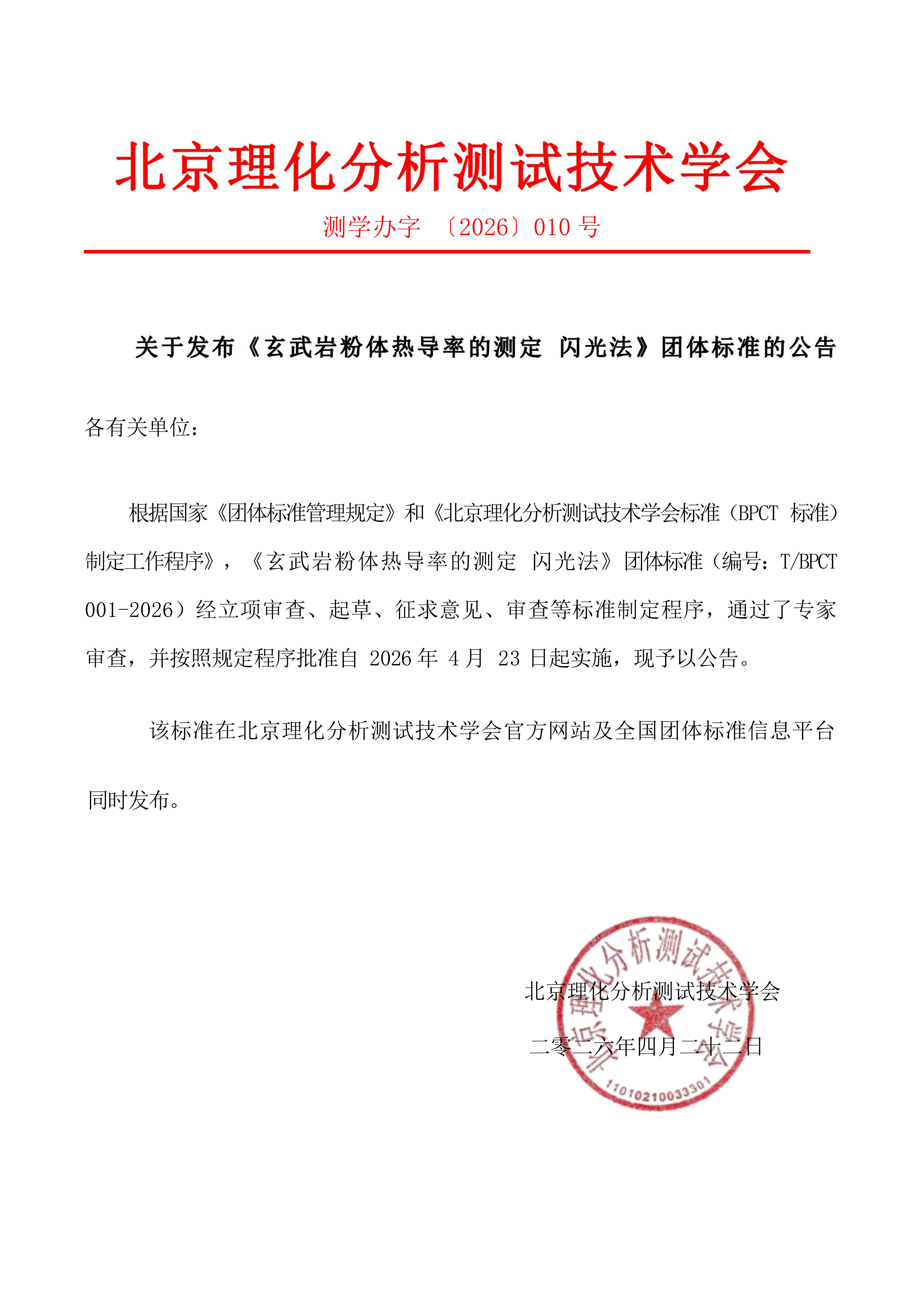 关于发布《玄武岩粉体热导率的测定闪光法》团体标准的通知
